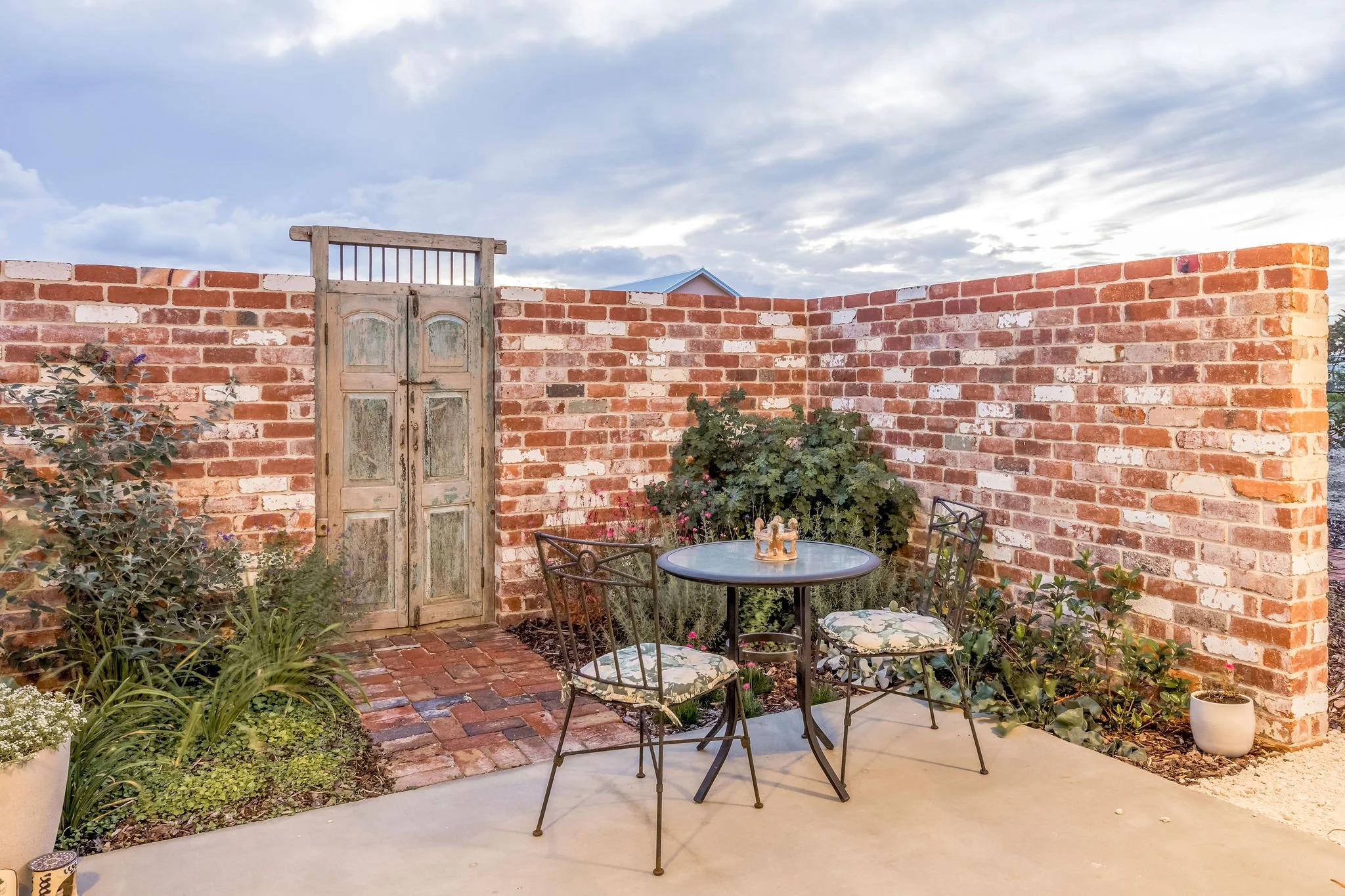 The home includes an authors retreat that overlooks a private courtyard with recycled bricks and reclaimed door that provides inspiration for Annie, a writer.