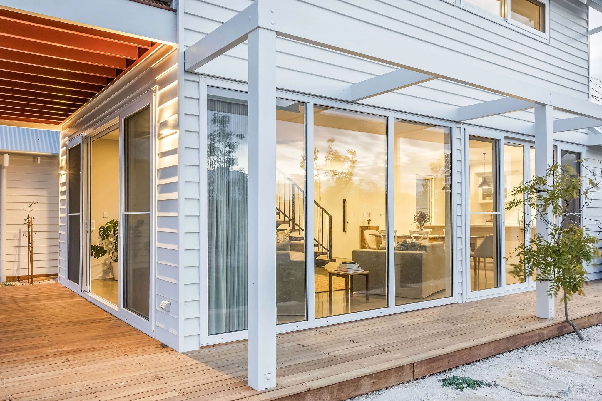 With white as the predominant colour, this home maximises views over the fields and dam in the distance, while providing a multi-generational home for the client and their family.